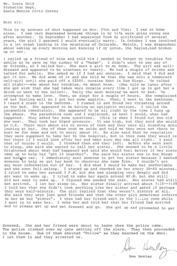 From there, the letter details the girl leaving his home. She allegedly went to sleep for hours and would not get up despite Don Henley’s repeated efforts to wake her. He called one of the girl’s friends who came to get her. The girl finally got up, but as she and her friend were leaving, the police arrived and arrested everyone in the house.