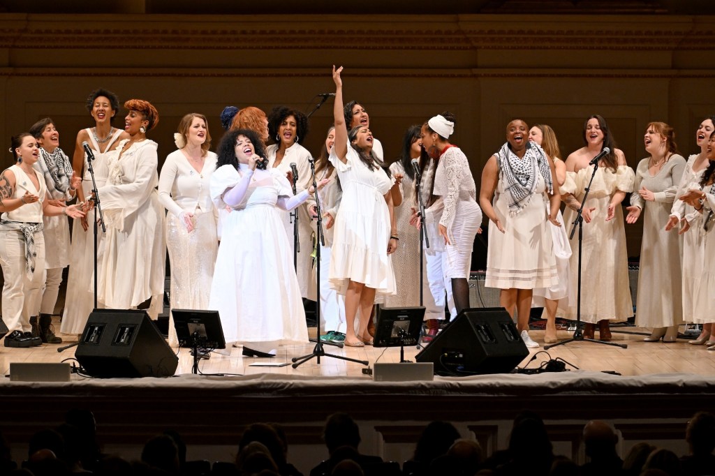 “There are people in this city who are hungry,” said Abena Koomson-Davis, musical director and conductor of the Resistance Revival Chorus. “Your neighbors need you. It’s time be a really good neighbor.” She added, “We believe that resistance is necessary … but it needs to be joyful,” citing the legacy of the freedom singers, before the group moved into Reverend Robert Wesby’s 1961 freedom song, “Woke Up This Morning (With My Mind Stayed on Freedom).”