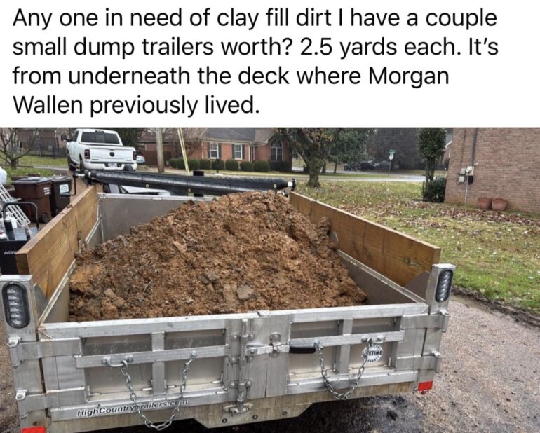 Posting a listing on Facebook, the individual showed a truck full of dirt. The person captioned the post, writing, “Any one in need of clay fill dirt. I have a couple small dump trailers worth? 2.5 yards each.” Although not appearing to be anything other than dirt, the person added, “It’s from underneath the deck where Morgan Wallen previously lived.”
