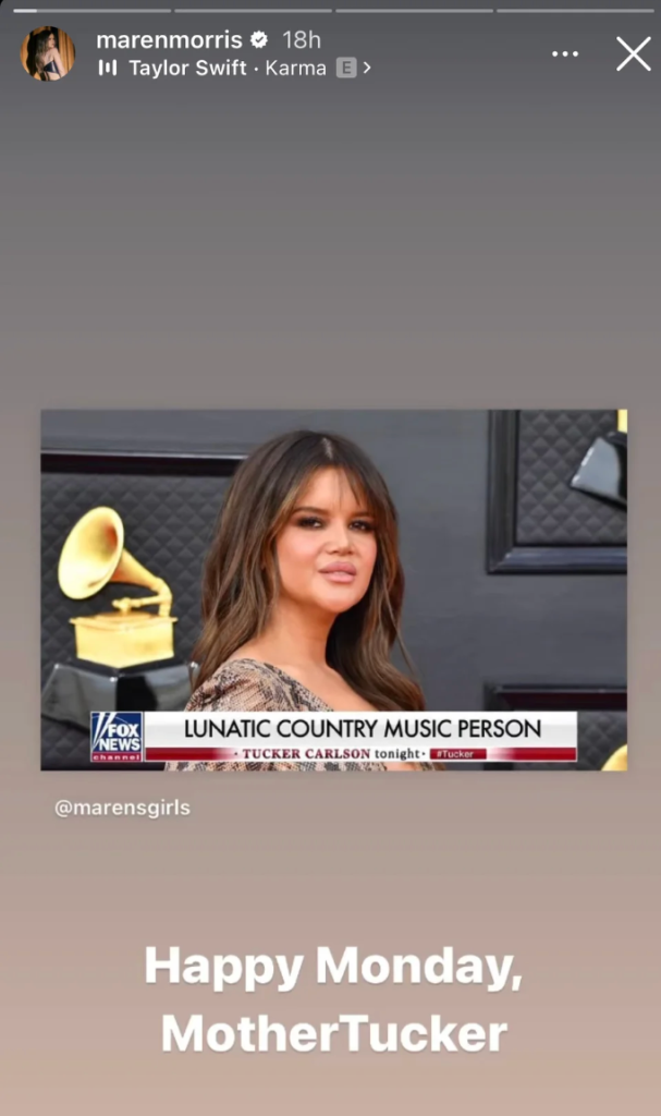Maren Morris did not have a case of the Monday blues yesterday (April 24), as she was celebrating Tucker Carlson’s unexpected exit from Fox News.