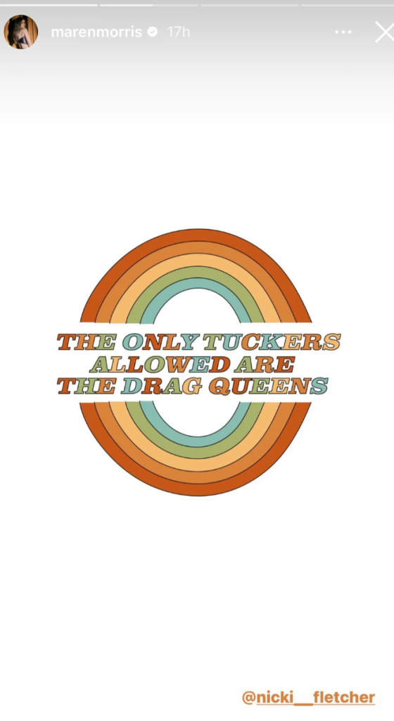 The caption was shared alongside a screengrab of the superstar’s face and a graphic that read “Lunatic Country Music Person” on Tucker Carlson Tonight. She also shared rainbow cover art that read: “THE ONLY TUCKERS ALLOWED ARE THE DRAG QUEENS.”