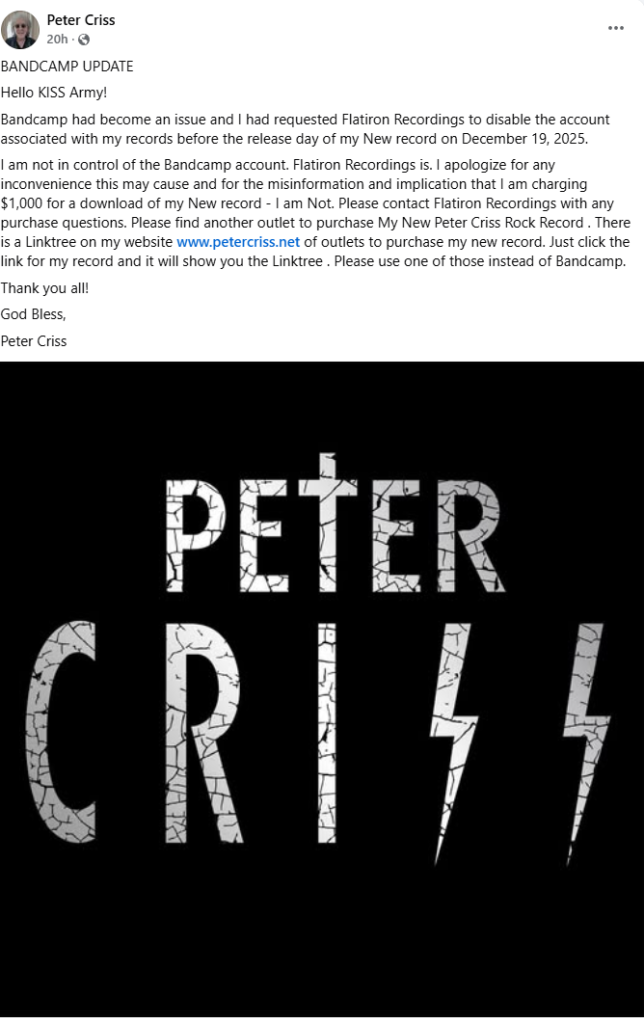 Not wanting his fans to be taken advantage of, Criss urged fans to contact Flatiron Recording with any questions about buying the album. He also added a few links of his own. “My New Peter Criss Rock Record. There is a Linktree on my website www.petercriss.net of outlets to purchase my new record. Just click the link for my record and it will show you the Linktree. Please use one of those instead of Bandcamp.”