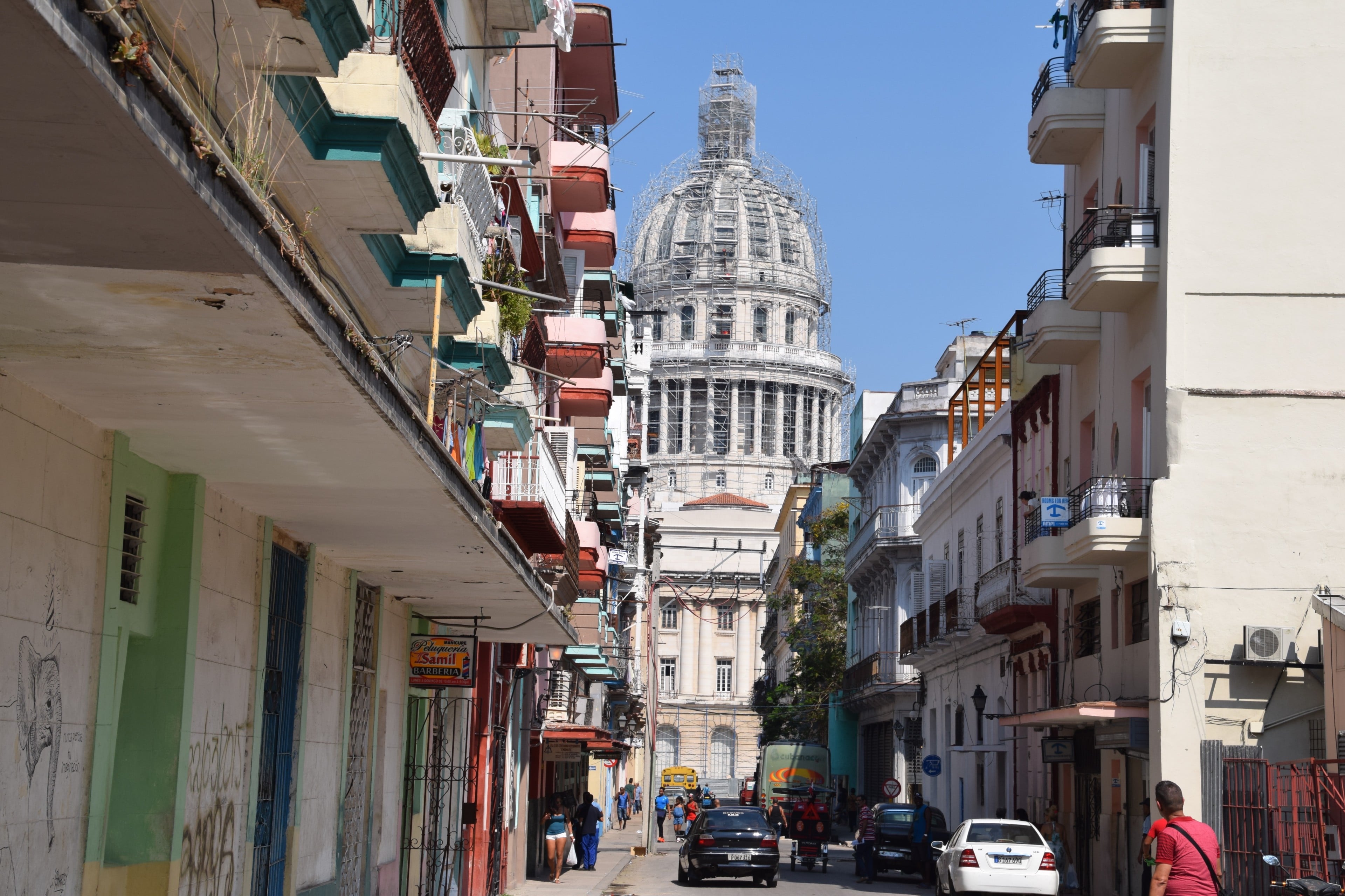 The view of El Capitolio from Calle Barcelona in Central Havana. The building ceased to be the center of government operations after the 1959 revolution. It is scheduled to reopen as the home of the Cuban National Assembly in 2018.